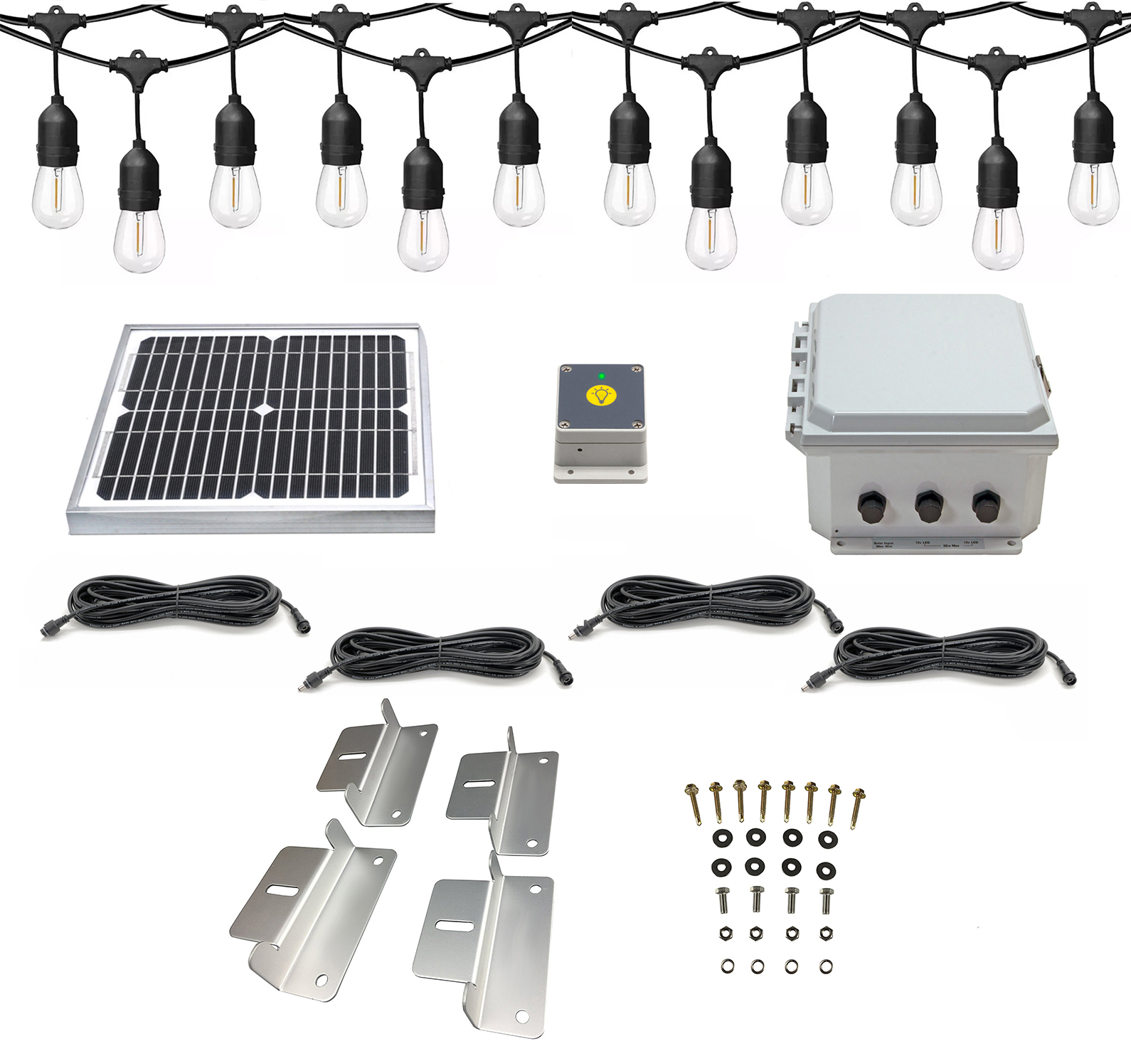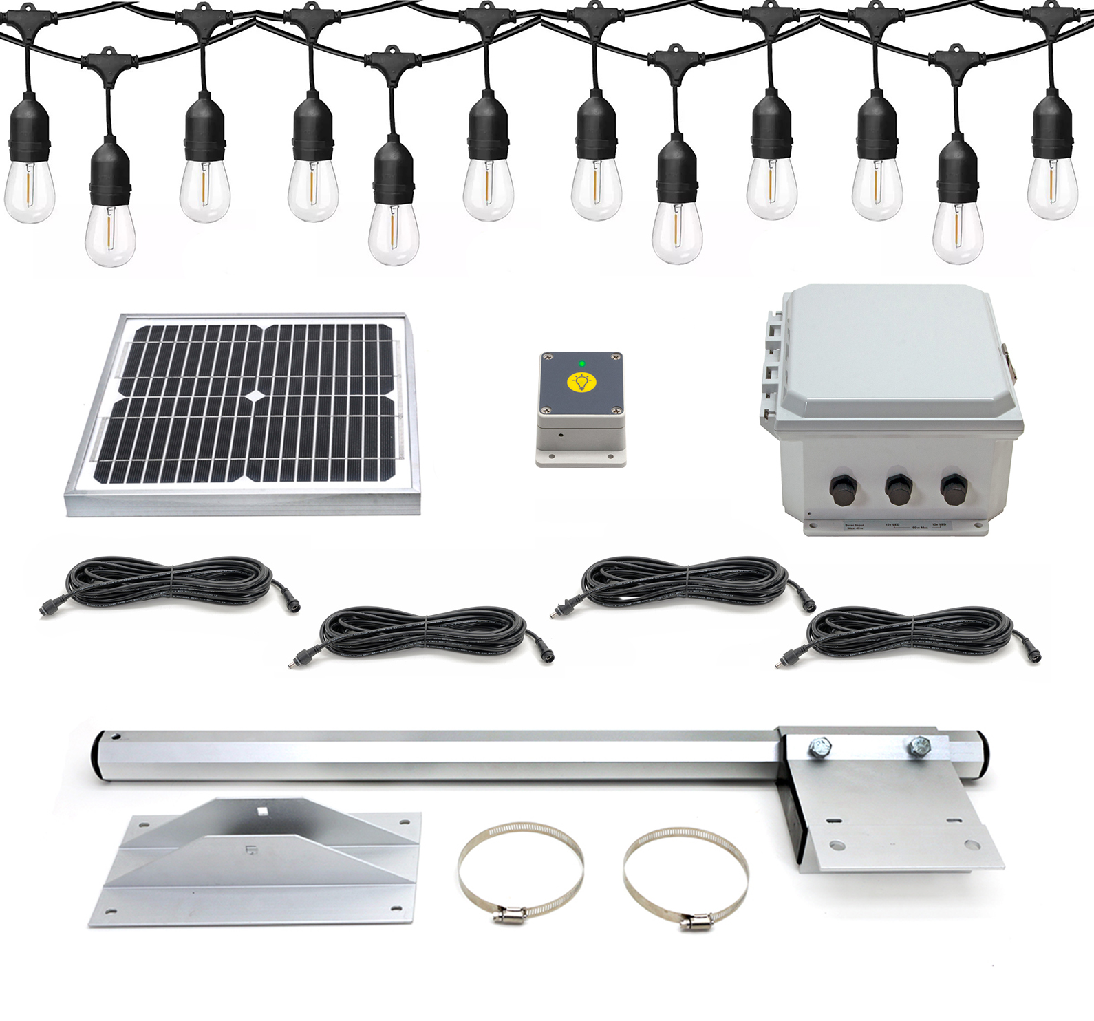 The Solar Gazebo & Pergola String Light Kit is constructed to last using only the best materials to withstand harsh marine environments and UV radiation. The easily-adjustable anodized aluminum mounting arm or roof mount Z-brackets resist corrosion and has the strength to withstand high winds and storms. Furthermore, Ultra Bright Tech manufactures the highest quality solar panels available and are rated for 20+ years life! With an emphasis on CELL quality, reliability, and longevity, the Solar Gazebo & Pergola String Light Kit meets the highest customer standards. Our panels feature monocrystalline cells, a superior solar technology when it comes to efficiency. Superb low lighting performance, these single-crystal, silicon cell panels have a long lifespan, high durability, and high reliability. These modules are sealed with low iron temper glass and anodized aluminum alloy frames The kit includes our powerful 10w-12v solar panel which is more than adequate to recharge the battery used to power the 48ft String LED light or multiple lights.